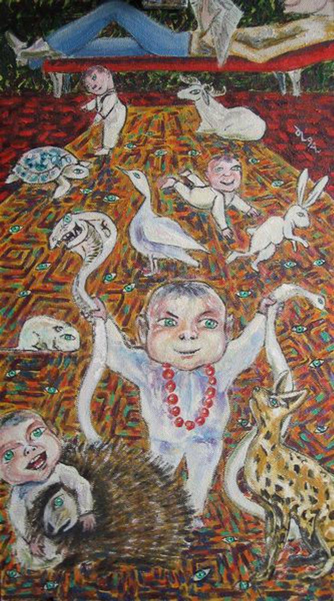 "The eternal problem of fathers and children" 45x83,5 cm. Oil on hardboard. 1994. In a private collection