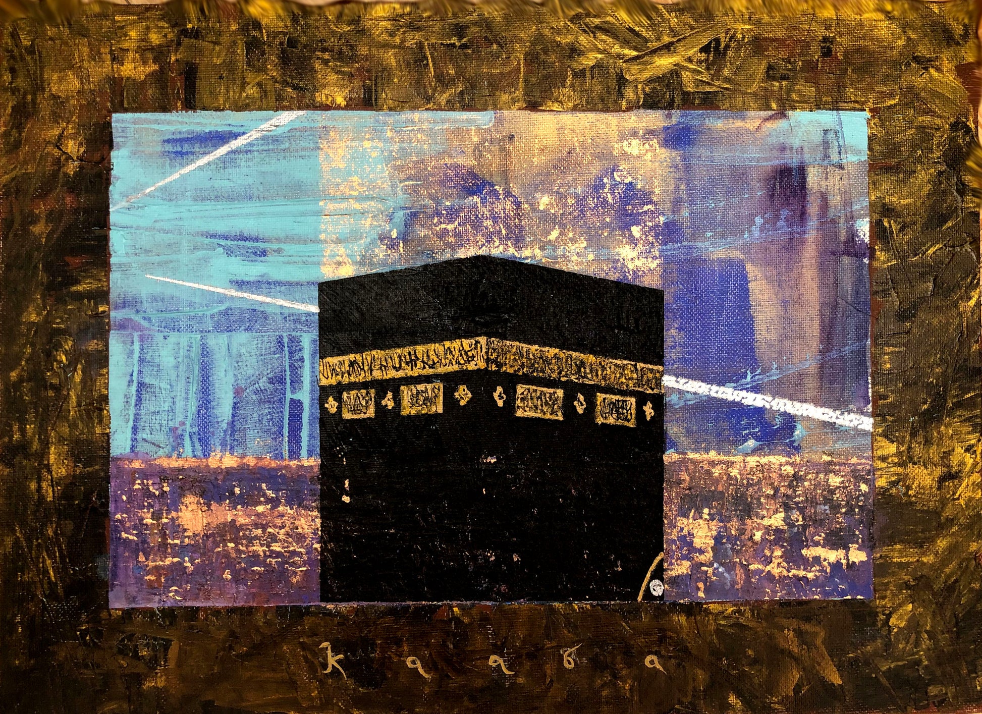 Acrylic on canvas. 40x30cm. 2024. The diptych opens a series dedicated to sacred facts of various religions. On this part of the diptych you can see a symbolic image of Earthly Kaaba as well as. symbols of the presence of the material world in the background. Expressive brushstroke style. Acrylic and Dutch metal on canvas. Varnish protection. Hanging hardware is included