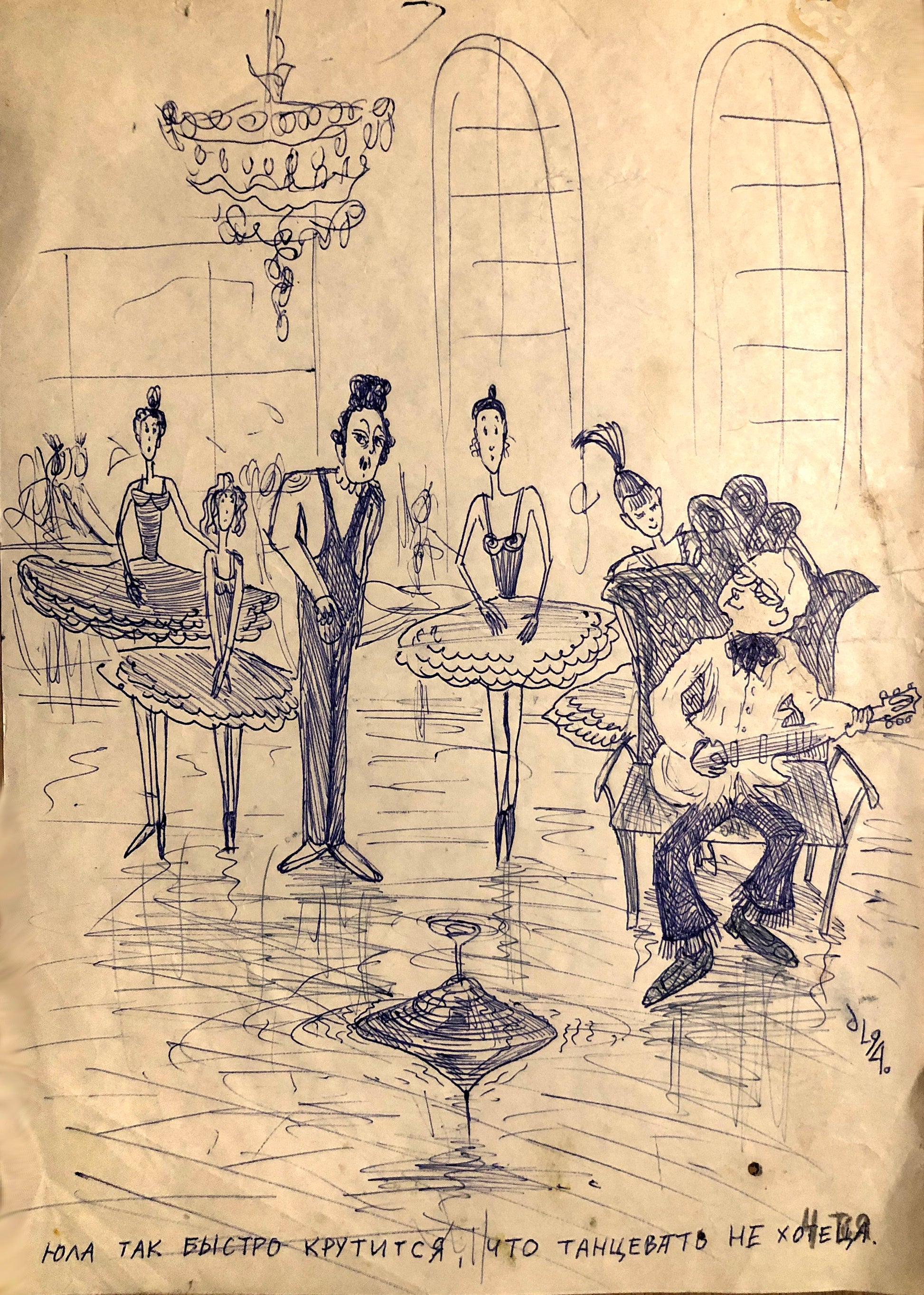 21x29 cm. Ballpoint pen on paper. 1994. The original text in Russian reads : "The top is spinning so fast that you don't feel like dancing" For greater safety, the work is delivered on a hard cardboard tablet.
