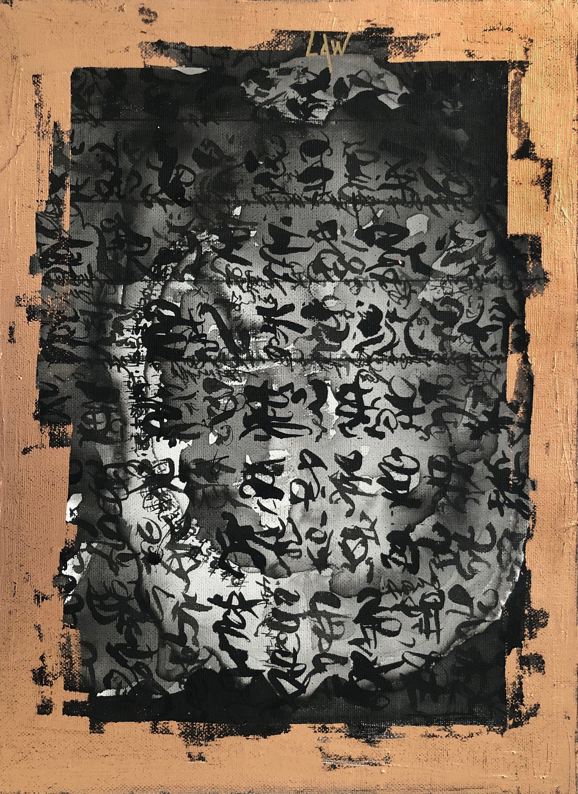 Acrylic &ink on canvas. 30x40 cm. An experience of depicting hidden concepts using psychographic techniques and calligraphyAcrylic and Dutch metal on canvas. Varnish protection. Hanging hardware is included