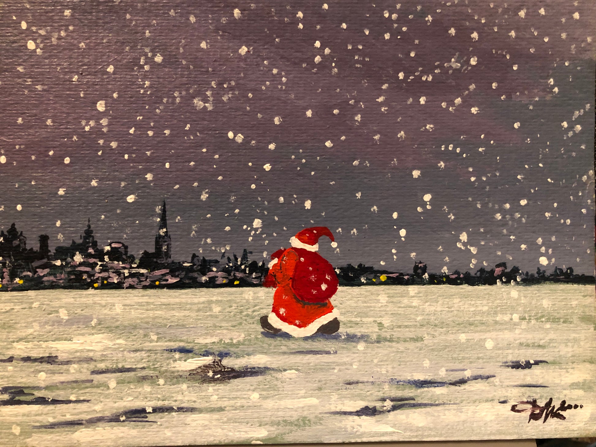 Handmade postcard from Christmas series. 29x21cm. Oil on hardboard.